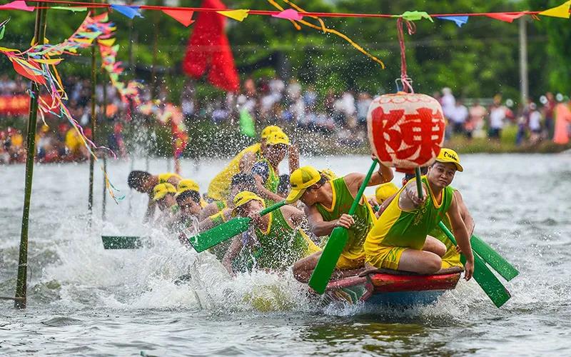 賽龍舟是端午節(jié)的主要習俗。相傳起源于古時楚國人因舍不得賢臣屈原投江死去,許多人劃船追趕拯救,他們爭先恐后,追至洞庭湖時不見蹤跡,之后每年五月五日劃龍舟以紀念之,相傳劃龍舟是為了驅(qū)散江中之魚,以免魚吃掉屈原的身體。