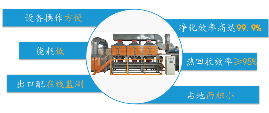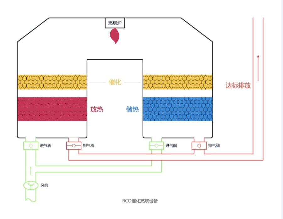在工業(yè)生產(chǎn)過(guò)程中,排放的有機(jī)尾氣通過(guò)引風(fēng)機(jī)進(jìn)入設(shè)備的旋轉(zhuǎn)閥,通過(guò)選轉(zhuǎn)閥將進(jìn)口氣體和出口氣體完全分開(kāi)。氣體首先通過(guò)陶瓷材料填充層(底層)預(yù)熱后發(fā)生熱量的儲(chǔ)備和熱交換,其溫度幾乎達(dá)到催化層(中層)進(jìn)行催化氧化所設(shè)定的溫度,這時(shí)其中部分污染物氧化分解;廢氣繼續(xù)通過(guò)加熱區(qū)(上層,可采用電加熱方式或天然氣加熱方式)升溫,并維持在設(shè)定溫度;其再進(jìn)入催化層完成催化氧化反應(yīng),即反應(yīng)生成CO2和H2O,并釋放大量的熱量,以達(dá)到預(yù)期的處理效果。