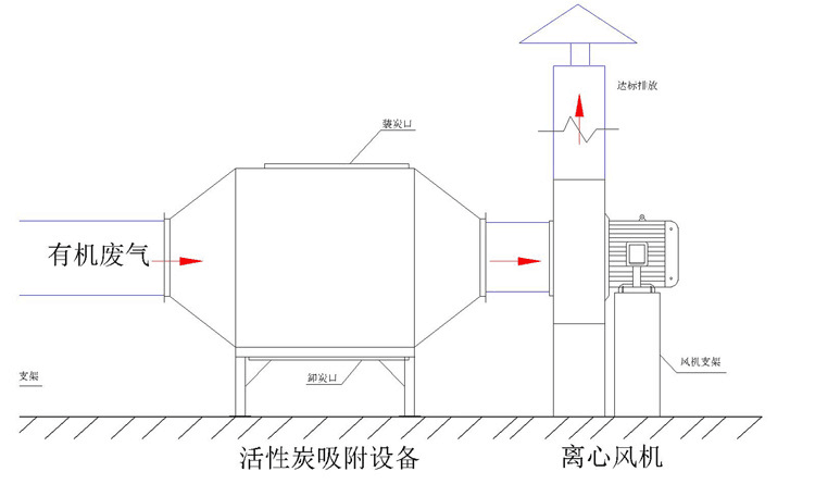 有機廢氣氣體由風機提供動力,正壓或負壓進入活性發(fā)吸附箱內(nèi),由于活性炭固體表面上存在著未平衡和未飽和的分子引力或化學健力,因此當此固體表面與氣體接觸時,就能吸引氣體分子,使其濃聚并保持在固體表面,污染物質(zhì)從而被吸附,廢氣經(jīng)過濾器后,進入設(shè)備排塵系統(tǒng),凈化氣體高空達標排放。