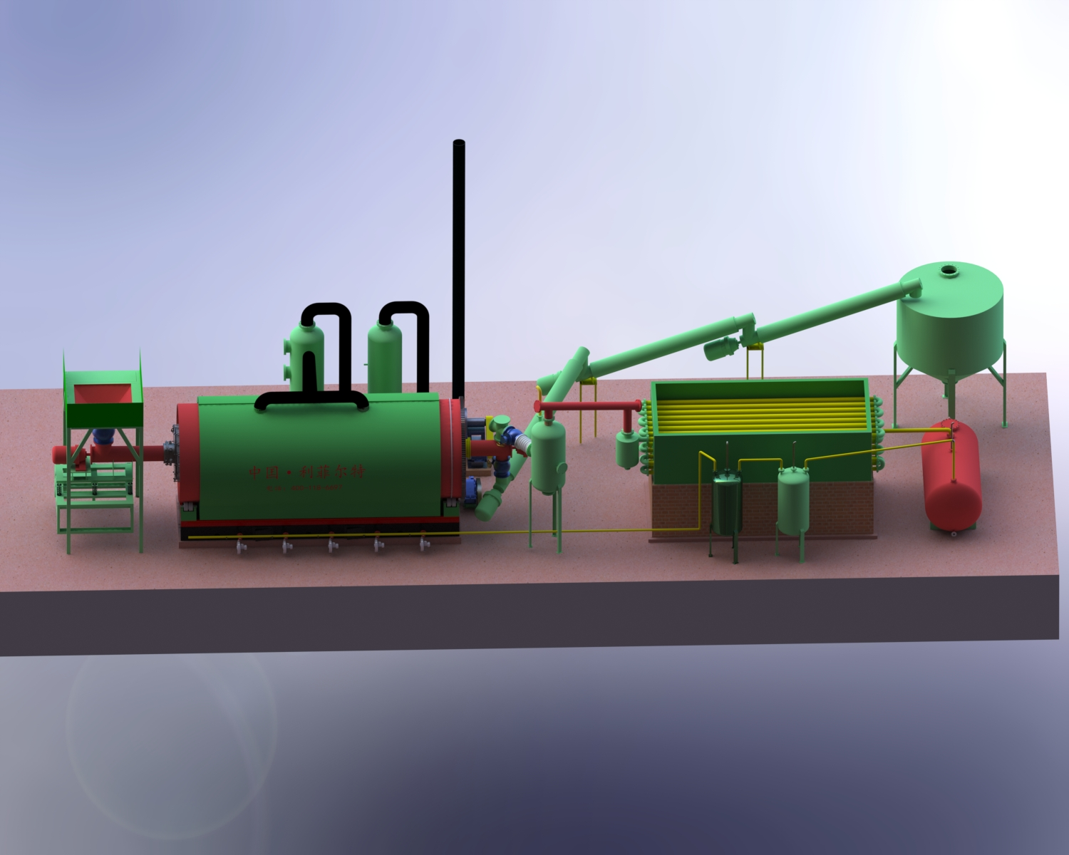 廢輪胎煉油設(shè)備是通過(guò)高溫裂解加熱分解成油氣,不可冷凝氣體和生物炭的流程,之后油氣再通過(guò)冷卻系統(tǒng)冷卻成液化油,不可冷凝的可燃性氣體可以直接回收利用于反應(yīng)釜的加熱,多余氣體也可以用于加熱其他系統(tǒng),例如過(guò)濾,燃燒器等。